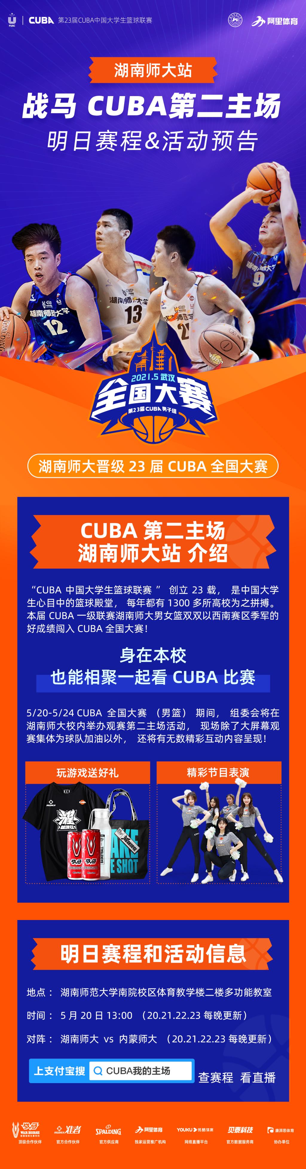 5月20日13:00,湖南师范大学晋级23届CUBA全国大赛,我校对阵内蒙师范大学CUBA第二主场将于我院鸿健楼二楼多功能组织观看。