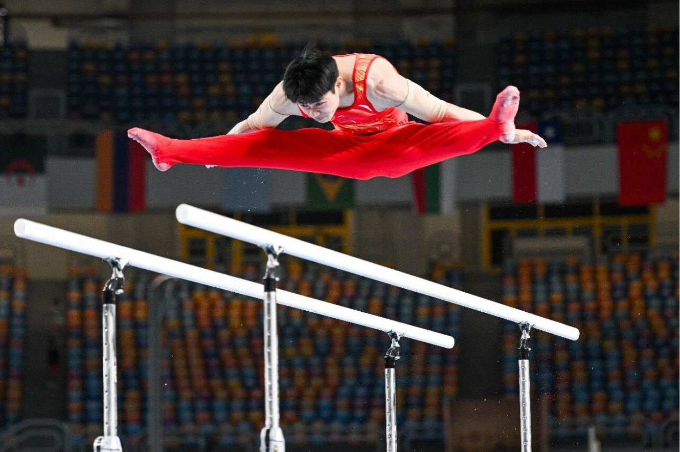 在男子双杠决赛中,刘洋表现出色,他的成套动作规格高、衔接流畅,尤其是高难度(G组)的下法动作完成得干净利落,最终获得全场最高分,力压群雄,将金牌收入囊中。
