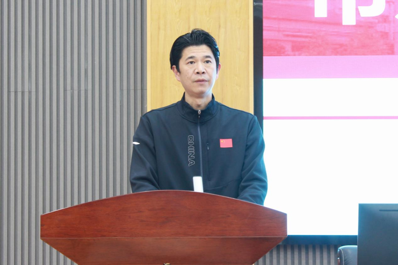 李皓就考试组织工作进行部署,并对全体领队、教练员提出要求:一要落实管理责任,积极配合考点各项组考安排;二要加强考生教育,严肃考场纪律,严禁将手机等通讯设备带入考场;三要细致做好考生后勤服务与安全管理。他对考试流程、考生须知、考场安排等事项进行了说明,并结合实际案例重点强调了考试纪律。他要求领队督促考生认真学习《考试细则与评分标准(2026版)》,并注意专项考试着装、物品携带、热身准备等相关事项。