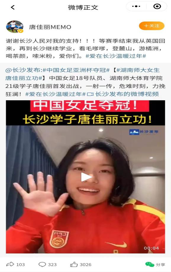 2月7日,唐佳丽同学在微博透露,等赛季结束,从英国回来之后,她将回到我院和同学们一起学习。随后,《长沙发布》也在视频号中发布了唐佳丽夺冠后许下新年愿望的视频。唐佳丽同学表示,在赛季结束后回到学校,她希望能够顺利完成学业,还想去橘子洲头拜毛爷爷、吃米粉、喝茶颜悦色、逛湖南省博物馆……